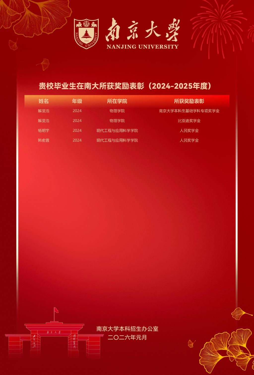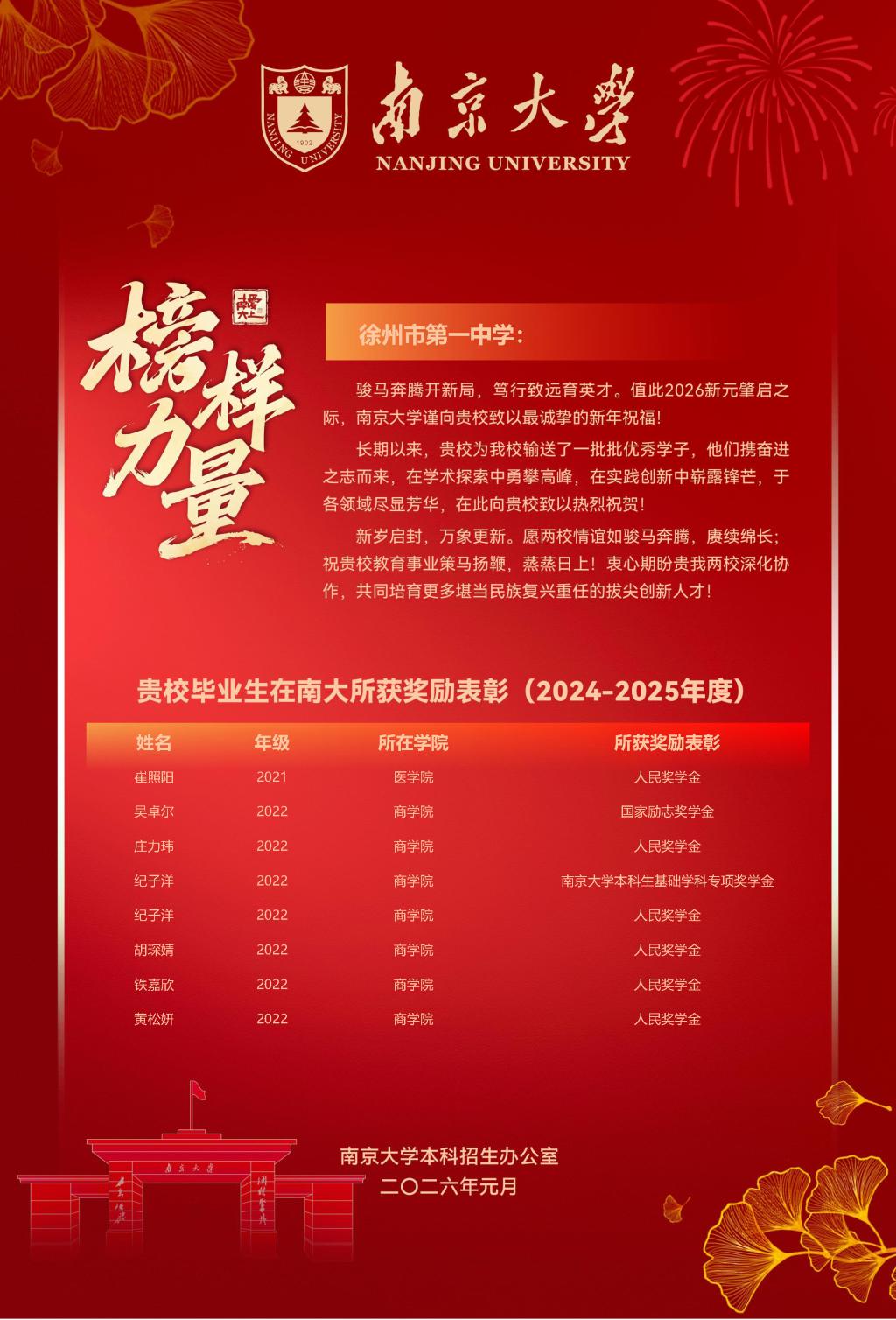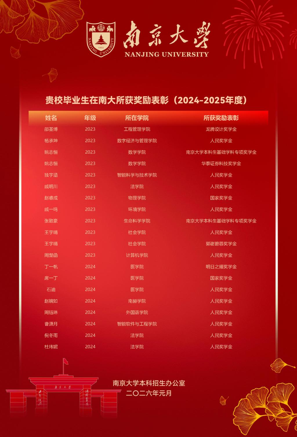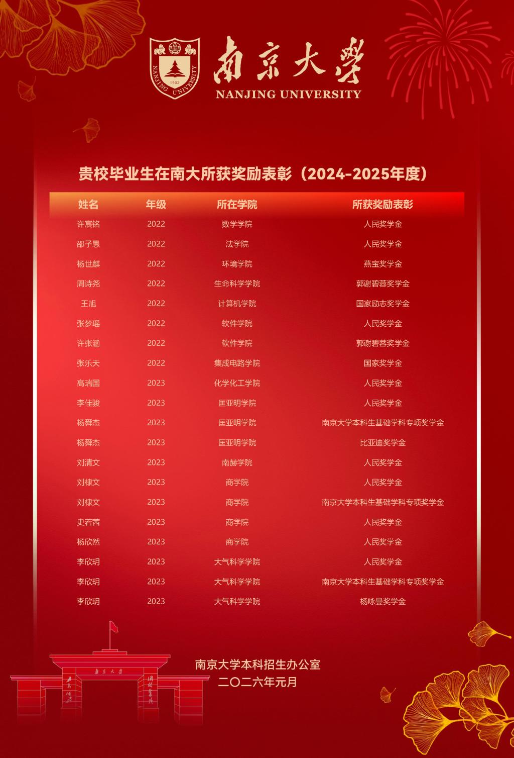近日,南京大学发来喜报,我校毕业生考入南京大学后,在学术探索中勇攀高峰,在实践创新中崭露锋芒,共有55人次斩获国家奖学金、人民奖学金、基础学科专项奖学金等多项荣誉,为母校赢得荣光。