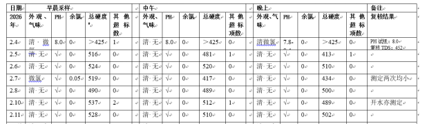1. 采样:2026年2月5日至11日,每日早晨8:00、中午12:00、晚上18:00各采集一次水样,共21份。记录水样外观、气味。