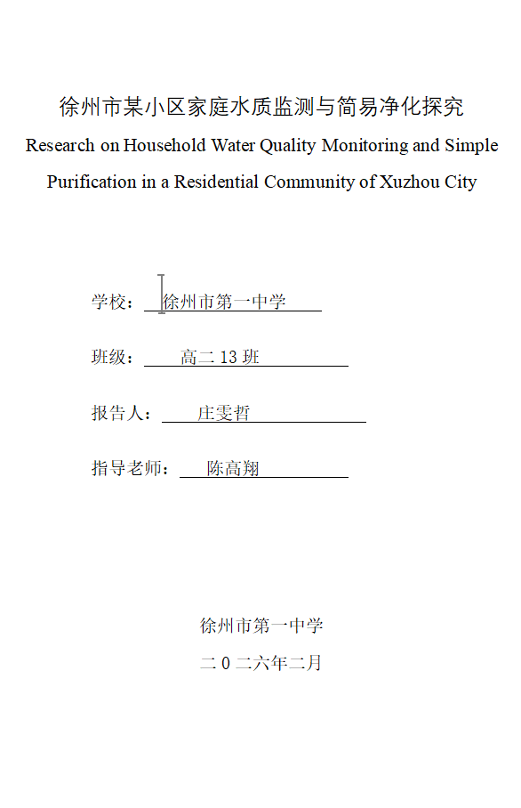 为培养学生创新思维和跨学科实践能力,徐州一中在寒假期间设计了“身边的科学与创新”多学科融合科创实践作业,鼓励学生从生活实际中发现问题,运用数学、物理、化学、生物、地理等多学科知识开展小课题研究。本次“社区/家庭水质监测与简易净化探究”这是五个可选主题之一,旨在引导学生关注家庭饮用水安全这一真实问题,综合应用化学(pH、余氯、硬度检测)、物理(过滤、沉淀原理)、数学(数据统计、建模评分)、生物(微生物观察)等学科知识,提升科学探究、数据分析与动手实践能力。同时,作业要求独立完成、真实记录,并提交完整的探究报告与支撑材料,充分体现“做中学”的科创教育理念。