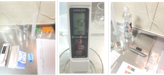 误差控制:为说明测定结果的正确性,同时用pH试纸复核pH值,用肥皂水振荡法辅助判断硬度(泡沫少则硬度高),并用TDS笔测量溶解性固体总量,验证试纸结果的准确性。