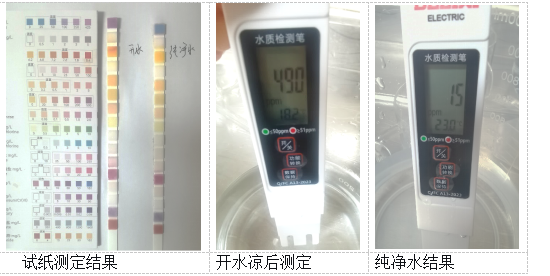 1.3误差控制:用pH试纸复核pH值,用肥皂水振荡法辅助判断硬度(泡沫少则硬度高),并用TDS笔测量溶解性固体总量,测定纯净水,利用各项结果印证试纸结果的准确性。接水后3分钟完成测定。