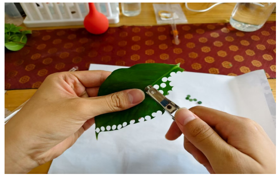 用打孔器在采集的叶片上钻取小圆片,每个试管对应的小圆片数量保持一致,一般为 10 - 12 片。操作过程中保证小圆片大小均匀,减少实验误差。