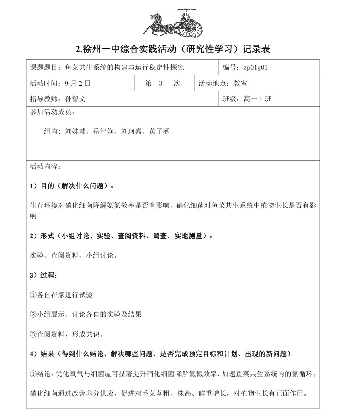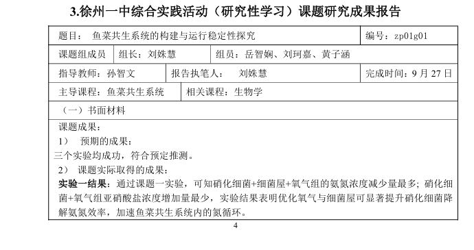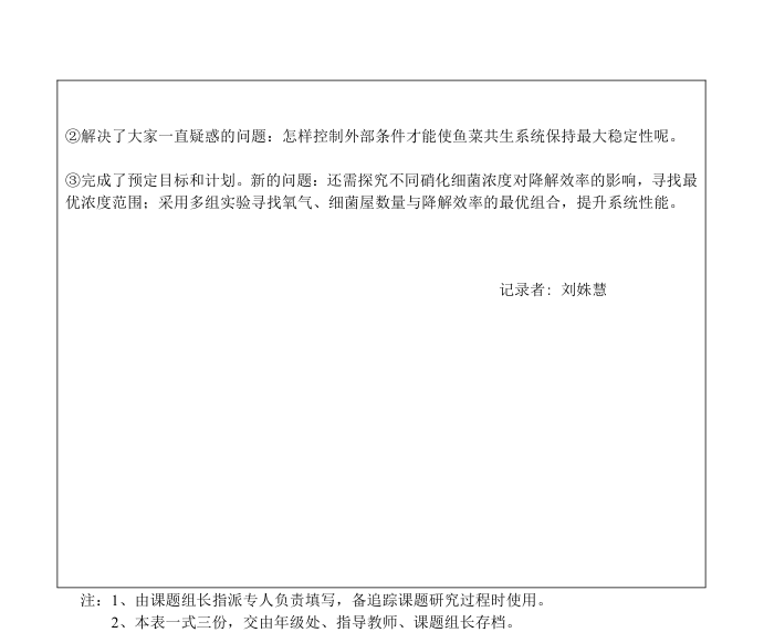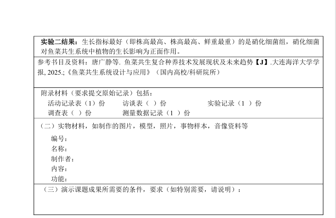 通过本次实验,我不仅掌握了鱼菜共生系统的核心逻辑,更体会到“生态平衡”的实践意义:小小的细菌、植物与鱼类,通过物质循环形成了彼此支撑的系统,这让我对可持续农业有了更具象的认知。实验过程中,从装置搭建的反复调试到数据的精准记录,锻炼了我的耐心与严谨性——科学研究从来不是“一次成功”,而是在问题中不断优化的过程。