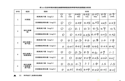 表1-3 生存环境对硝化细菌降解氨氮效率影响实验数据分析表