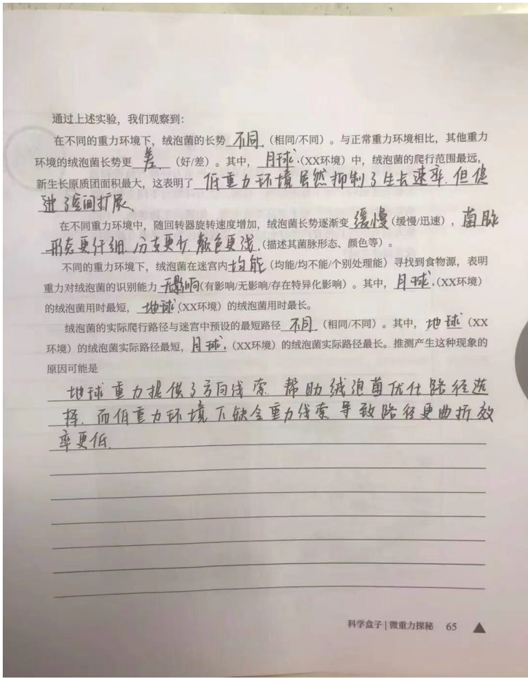 1. 目的(解决什么问题):通过自制回转仪模拟微重力环境,探究植物在微重力与地面常重力两种条件下,生长方向、形态结构(如根、茎、叶的发育)及生理响应(如向性运动、激素分布)的差异,明确重力对植物生长调控的关键作用,为空间植物学研究提供地面模拟实验依据。 2. 形式(小组讨论、试验、查阅资料、调查、实地测量):实验(自制回转仪装置搭建、植物培养与观测)、查阅资料(空间植物学文献、回转仪实验方法)、小组讨论(实验设计、数据分析、结果论证)。 3. 过程:① 完成自制回转仪装置的调试与校准,分组培育拟南芥(或绿豆、小麦等实验材料),设置回转仪模拟微重力组与地面常重力对照组,统一光照、水分、温度等环境条件;② 每日定时观测并记录两组植物的根、茎生长方向、株高、叶片数及形态差异,拍摄关键生长阶段照片与视频;③ 查阅微重力植物生理学相关资料,结合植物向性运动与激素调控的知识点,对实验现象进行理论分析,形成初步结论;④ 小组展示与讨论,梳理实验操作难点(如装置稳定性、样本一致性),优化后续观测方案。 4. 结果(得到什么结论、解决哪些问题、是否完成预定目标和计划、出现的新问题):① 结论:在回转仪模拟的微重力环境下,植物根、茎的向地性/向光性响应显著减弱,生长方向趋于随机化,株型更为紧凑;而地面常重力组植物表现出明显的向地性与向光性,生长方向稳定。这表明重力是调控植物生长方向与形态建成的关键环境信号。② 解决的问题:验证了微重力对植物向性运动的影响,明确了重力在植物生长调控中的主导作用,完成了“自制回转仪探究微重力下植物生长特点”的预定目标。③ 出现的新问题:不同植物种类对微重力的响应程度存在差异;回转仪模拟微重力与真实太空微重力环境的等效性仍需进一步验证;植物内部激素(如生长素)的分布变化机制有待深入研究。 记录者:翟婧含 |