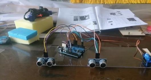 1.2准备一个长至少20cm的塑料板,参考手册将两个超声波传感器,和舵机粘贴到塑料板上,并测量彼此之间的距离。