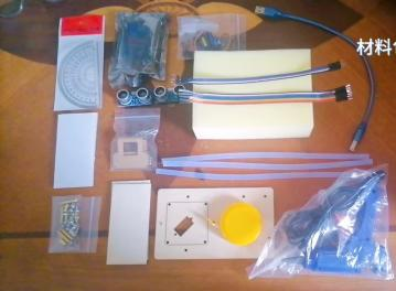 Arduino 开发板、方口数据线、SG90 舵机、HC-SR04超声波传感器、亚克力塑料板、卷尺、热熔胶棒、热熔胶枪、杜邦线,螺丝刀、透明胶带,高密度泡沫,记号笔,裁纸刀。