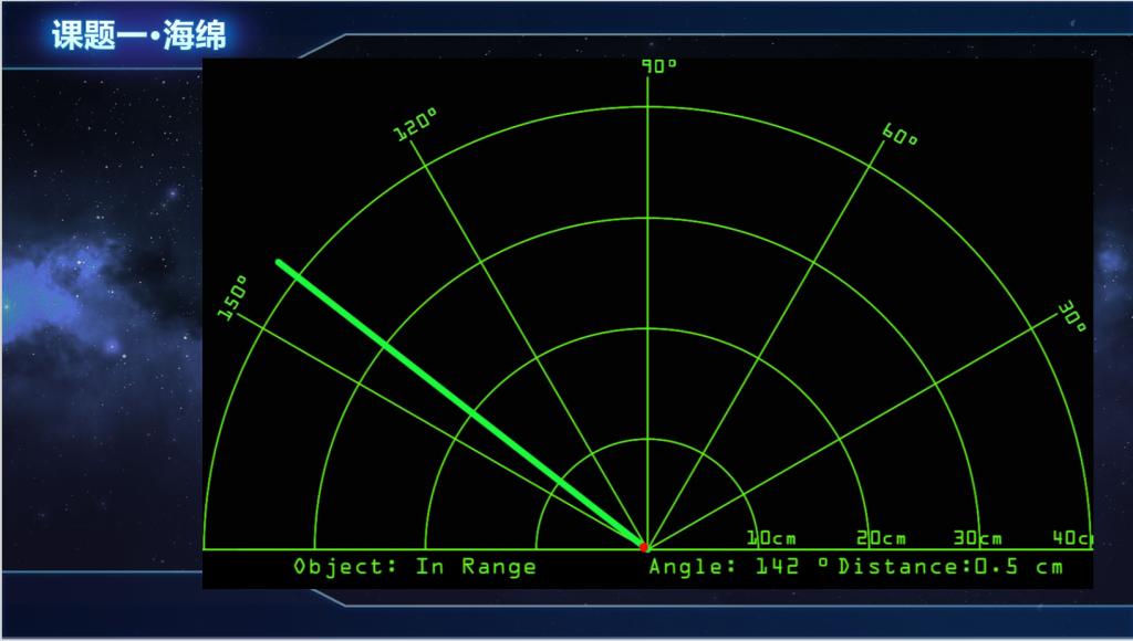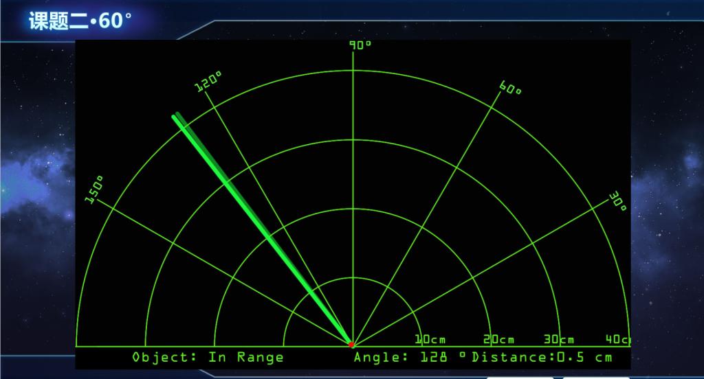 2. 软件部分:使用Arduino IDE编写控制代码,实现舵机角度控制、超声波测距数据采集,并通过串口通信将数据实时传输至上位机(PC)。在上位机使用Processing编写的程序,将极坐标下的距离-角度数据实时转换为二维平面雷达扫描图像。
