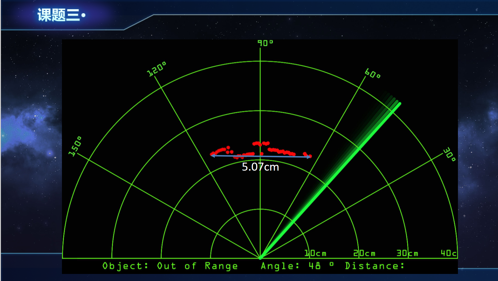对于每组实验,记录雷达扫描生成的图像特征,并定量记录传感器返回的原始距离数据及其稳定性(如多次测量的标准差)。
