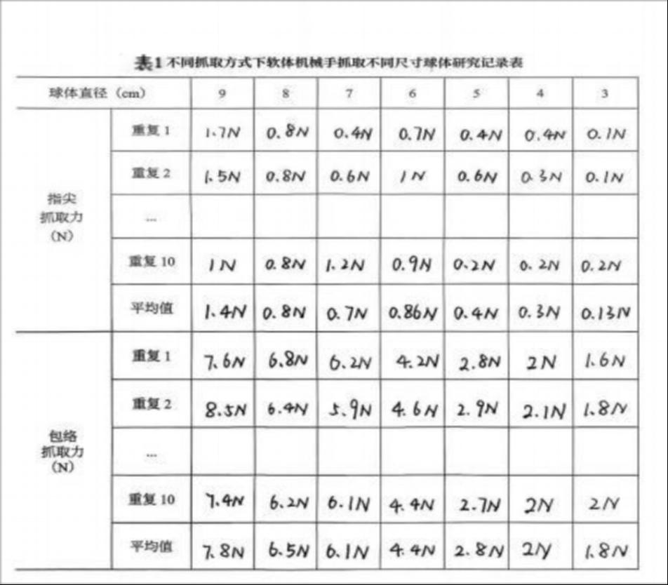 (4)用软体机械手夹持球体,用弹簧测力计勾住塑料球壳上的轮胎线,数值缓慢匀速向上拉动,直至球体被拉出软体机械手,在此过程中注意读取拉力计示数,记录最大值。每个球体每种抓取方式重复实验 10 次,记录每次实验的拉力最大值,最终取平均值