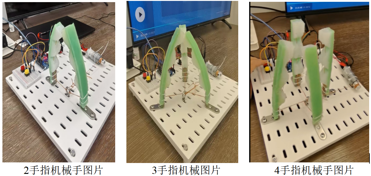 下图分别是按照《软体机械手的制作与抓取实验手册》2指、3指、4指软体机械手组装实验图片: