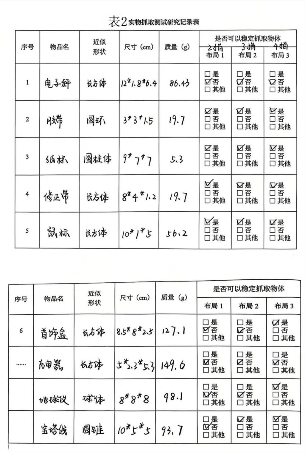 (2)选择大小形状不同的物体进行抓取实验,记录物体尺寸和质量,观察和记录不同数量手指的软体机械手在抓取不同物体时的抓取性能差异。