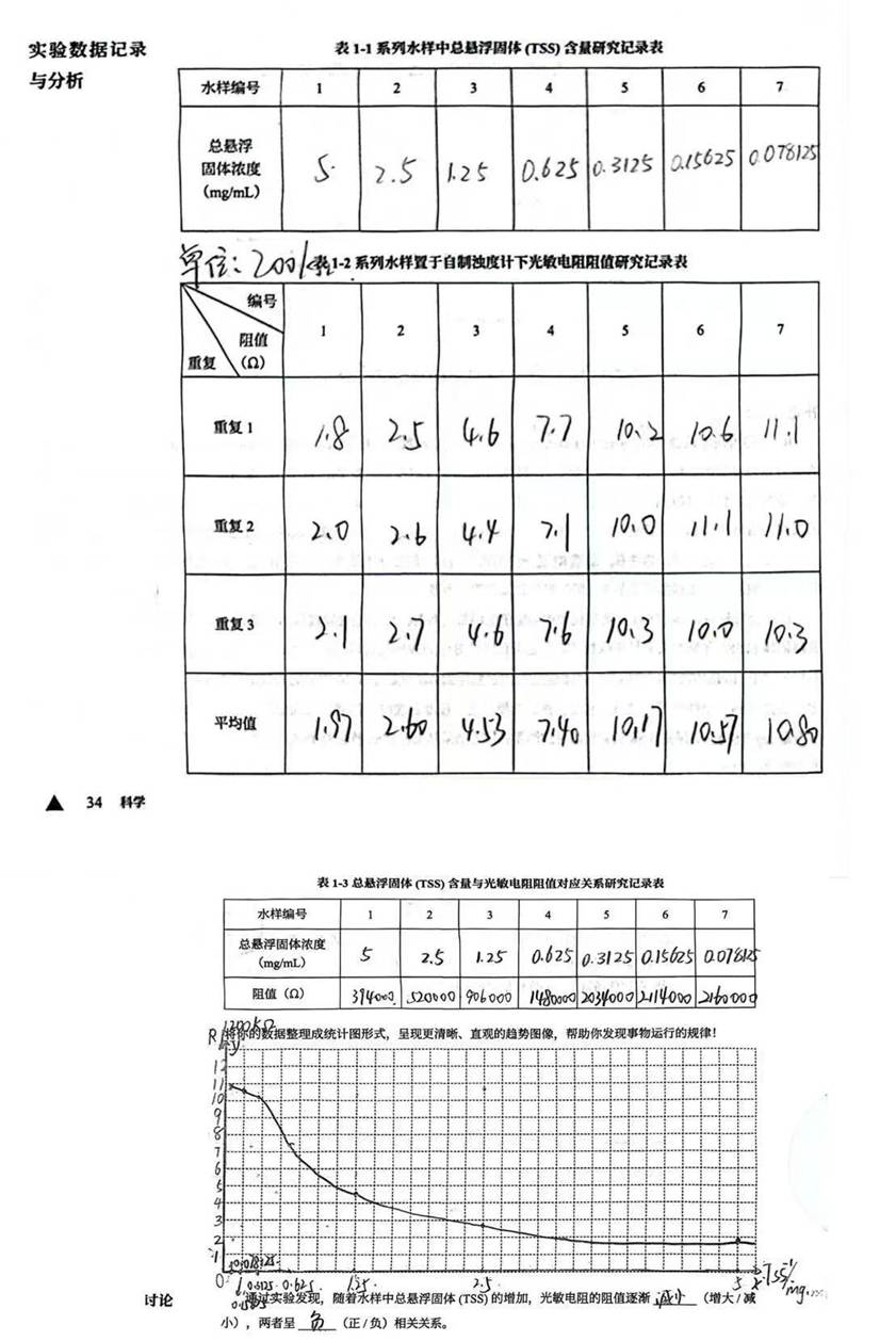 课题一实验结论:1.实验发现,随着水样中总悬浮固体(TSS)含量的增加,光敏电阻的电阻值逐渐减小,两者呈负相关关系;2.在实验过程中,水中的悬浮物是否均匀分散、LED灯泡的亮度、电池电量、房间的环境光均会对光敏电阻的阻值产生一定影响。