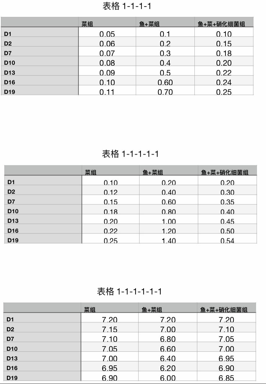 实验结果发现:氨氮值上升最慢(环境最稳定)的是⻥+菜+硝化细菌组,其次是菜组,最快(环境最不稳定)的是⻥+菜组。平均株高最高的组是⻥+菜+硝化细菌组,其次是鱼+菜组;平均茎粗最粗的组是鱼+菜+硝化细菌组,其次是鱼+菜组;平均鲜重最重的组是鱼+菜+硝化细菌组,其次是鱼+菜组。