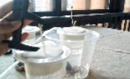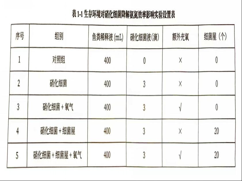 ①用量具量取400ml.提前配剖好的鱼粪稀释液,缓慢且平稳地注入每个培养杯中,按表1设置实验组,需要添加硝化细菌的组别用滴管滴入3滴硝化细菌液并搅拌,需要额外增加氧气的组别则利用氧气泵增加氧气,需要添加细菌(为硝化细菌提供附着生长的场所)的组别则放置20个清洗干净的细菌。为便于区分各实验组,建议使用记号笔在对应的瓶身清标注组别编号、日期及关键参数等信息,确保标记内容完整、准确且易干识别。