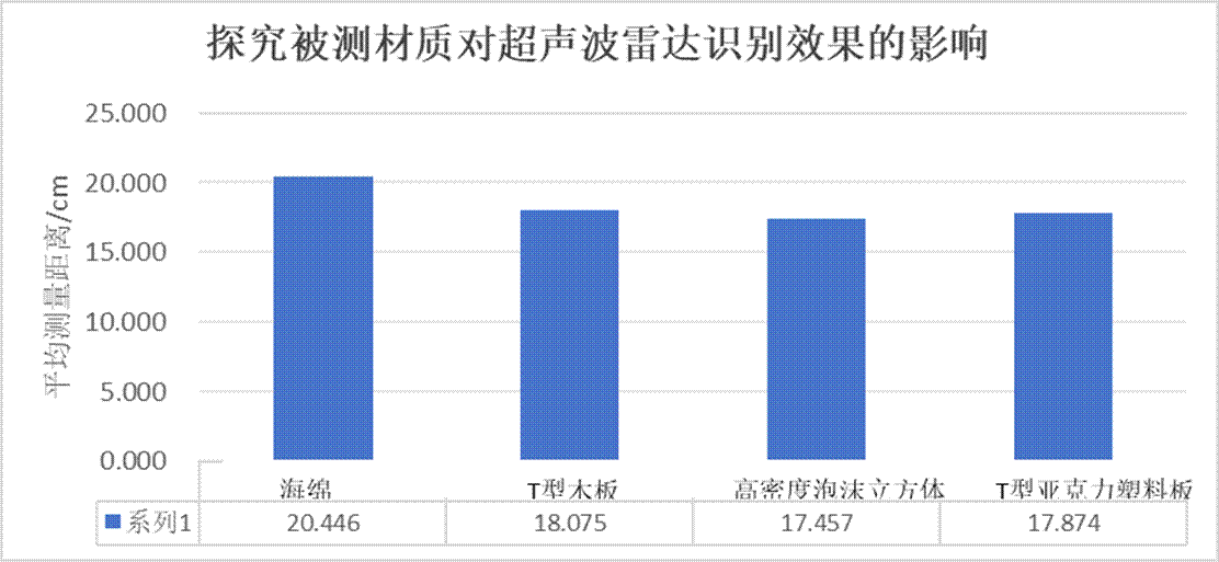 我们选取了四种材料:海绵、T型木板、高密度泡沫立方体、T型亚克力塑料板。将它们放在离传感器正好20.0厘米的地方,每种材料重复测量3次,计算平均值。
