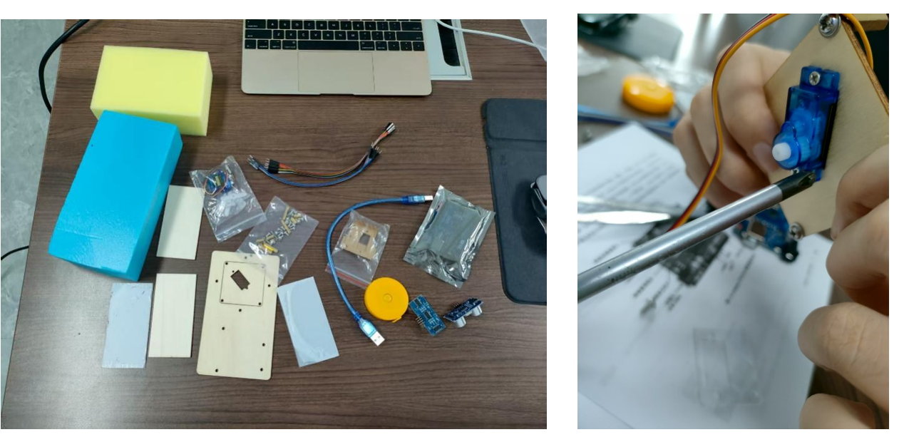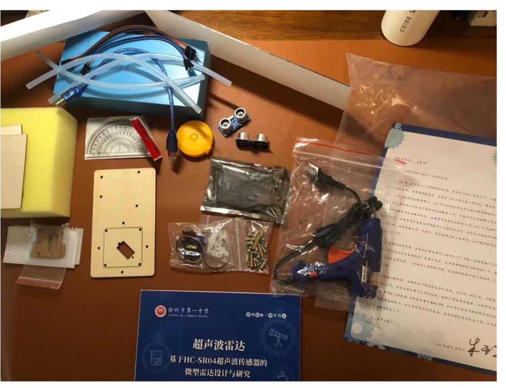 本次实验依托科创探究器材包开展,器材包含HC-SR04超声波传感器、Arduino UNO开发板、舵机等核心电子元件,以及杜邦线、电源模块、木质结构件等组装材料,同时配备电脑(含Arduino IDE编程软件)、不同材质障碍物(硬纸板、金属、布料)等实验辅助用品。
