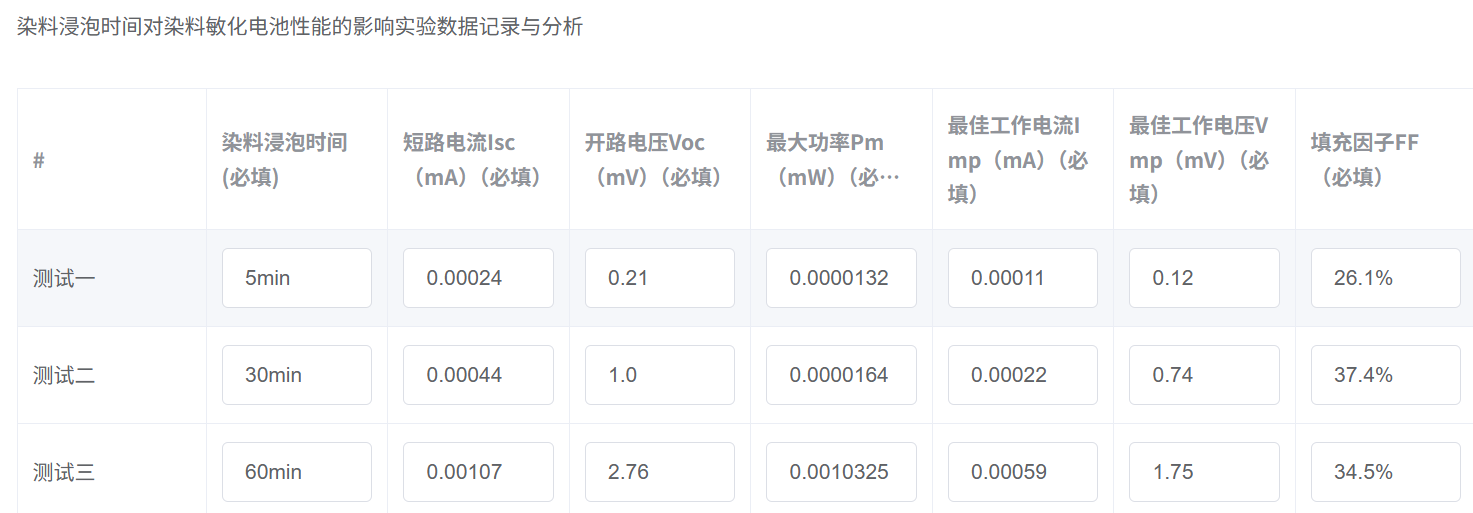 实验三、探究染料浸泡时间对染料敏化太阳能电池性能的影响,探究最佳浸泡时间。