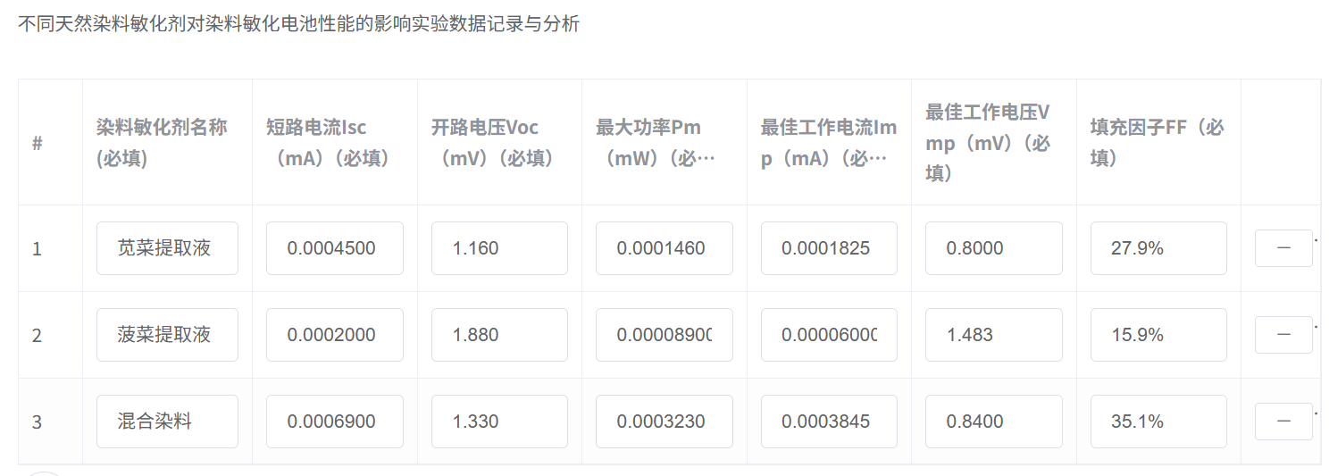 实验二、探究天然染料种类对太阳能电池性能的影响,选用两种天然染料以及一种混合染料的搭配;