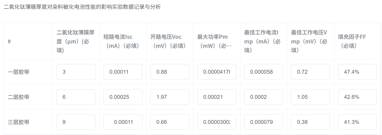 通过以上实验,可知二氧化钛厚度过大,影响部分染料与光线的接触面积,从而导致了开路电压和短路电流出现了减小