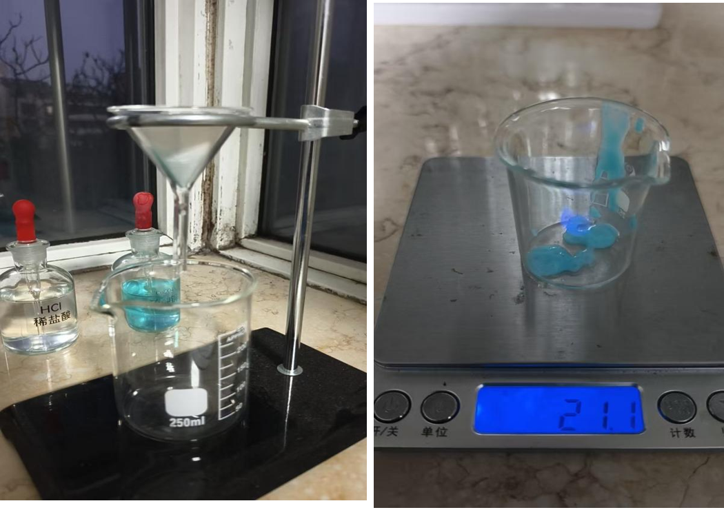 我们首先要将其过滤,我们向空烧杯中加入3.6g稀盐酸转移,测得杯中剩0.1g稀盐酸。根据计算,有沉淀的烧杯中物质质量应为21.1g+3.5g=24.6g。然而,实际质量减少了足足0.2g,说明产生了气体。