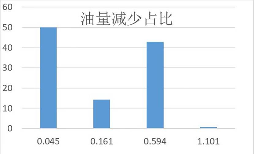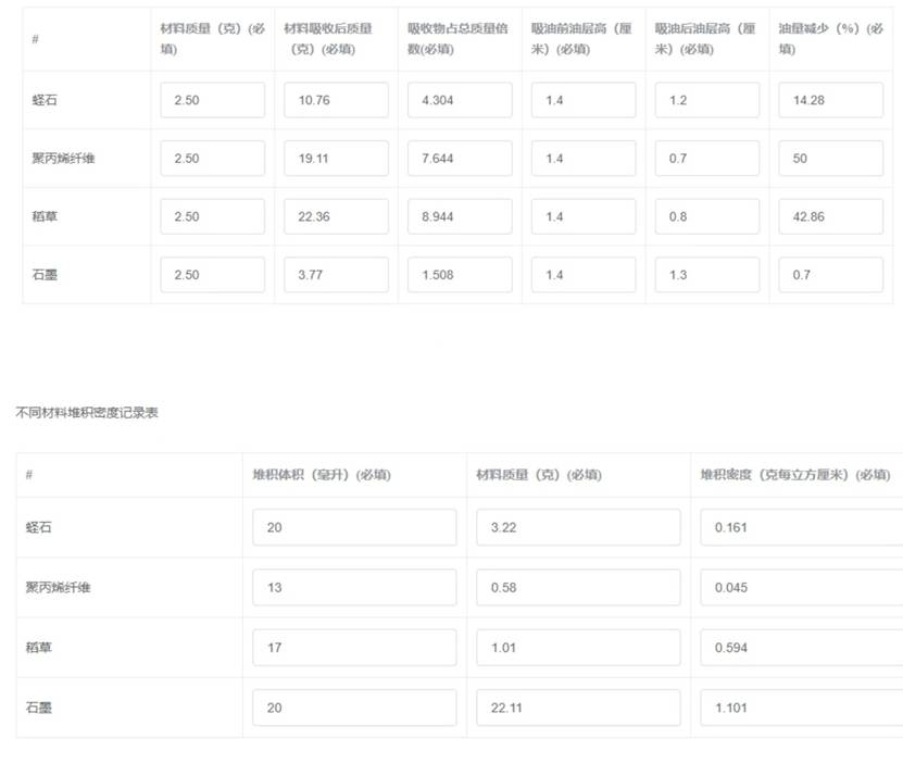 6)计算每种材料吸油后油量减少的比例(油量减少% =(吸油前油体积 - 吸油后油体积)/吸油前油体积×100% ,假设油密度均匀,可用油层高度计算体积 )以及吸收物占总质量倍数(吸收物占总质量倍数=材料吸收后质量/材料质量 )。