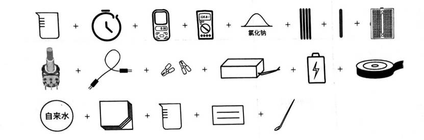 本实验选取的实验材料是量筒、秒表、数字万用表(或多用表)、万用表 、氯化钠(药品 )、电极(或金属棒)、玻璃棒、面包板、电位器、电源线、鳄鱼夹、电池、绝缘胶带、自来水(液体材料) 、纸巾、小量筒、标签纸、药勺 。