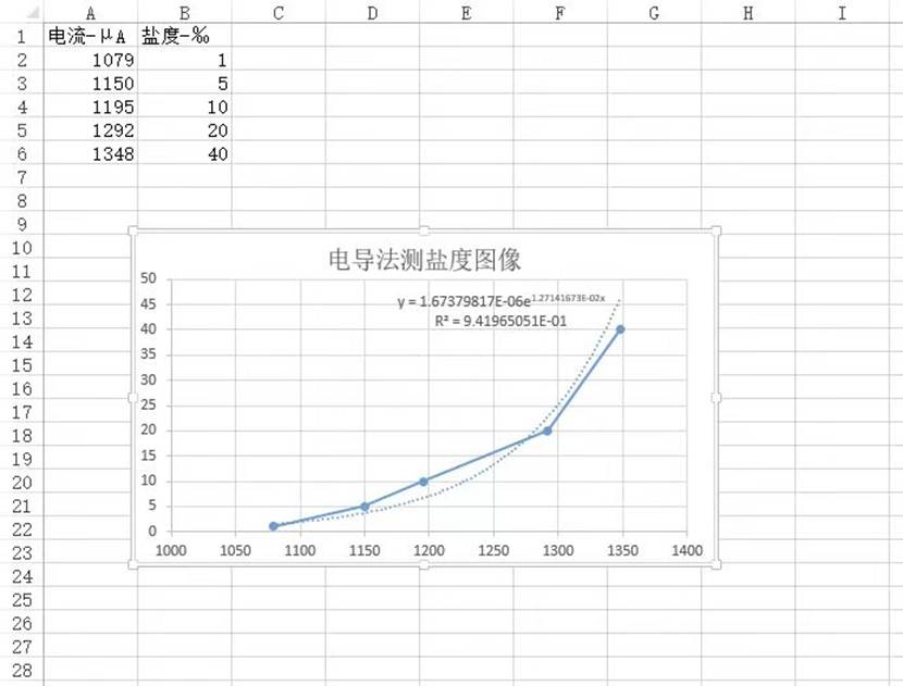 不同盐度对电流大小的影响在下图中,由下图表格可看出,不同盐度的海水会对电流表示数产生不同的影响。不同盐度下电流表示数见下图,电流表示数分别是1079、1150、1195、1292、1348微安。至于为什么电流表示数在不断减小,因为其发生了非常缓慢的电解反应,其时间过长、电压过大都会导致其示数变小。