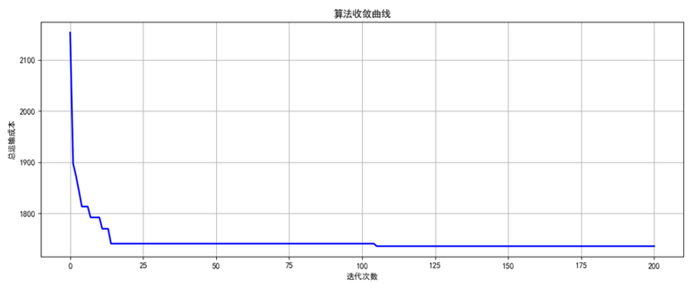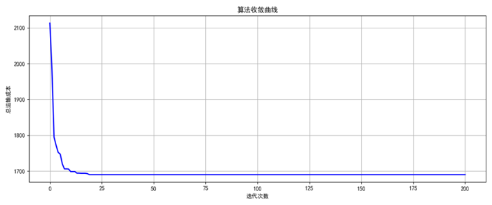 从图4-2-2可以看出,所有的社区需求点都分配到了相应的配送中心,图4-2-4中的算法收敛曲线显示,随着迭代次数增加,总运输成本迅速收敛,后逐渐平稳,说明算法得到了一个较为稳定的优化结果。