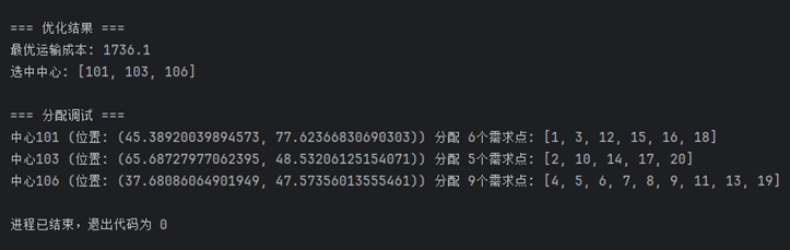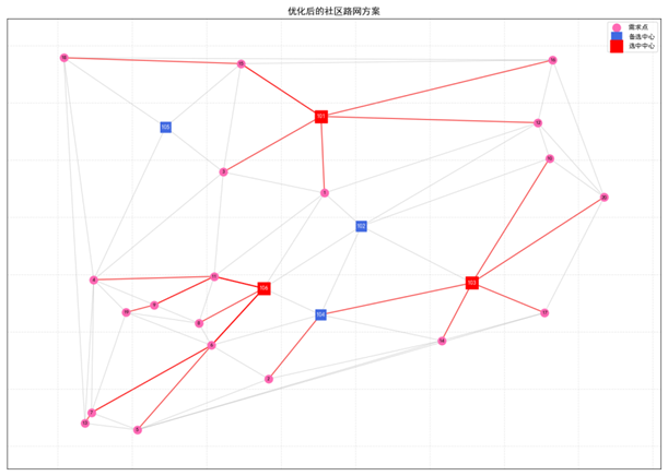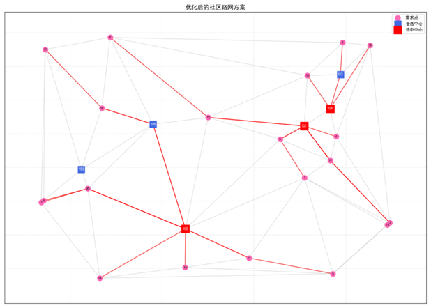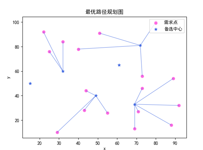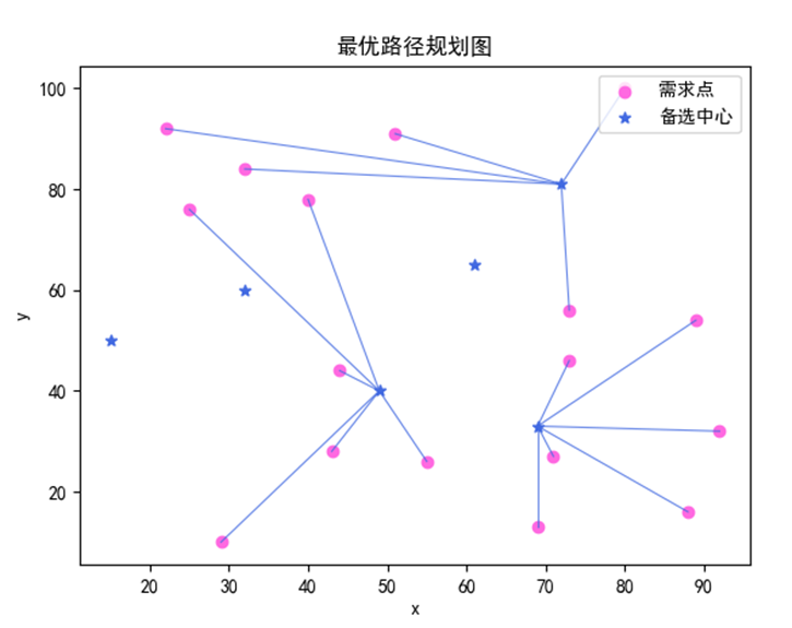 输出:最优的选址与分配方案,并通过可视化展示路径。