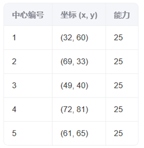 各备选中心(物资供应中心)的地理空间坐标与容量能力的数据表如下: