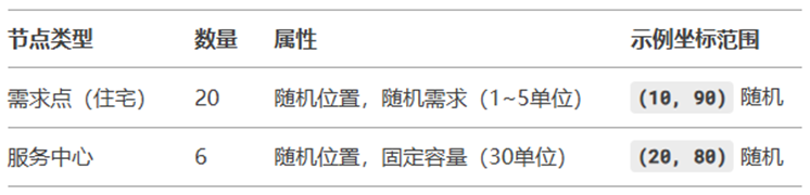 1需求点:模拟居民区,每个点有随机需求(本例中指物流配送量)。