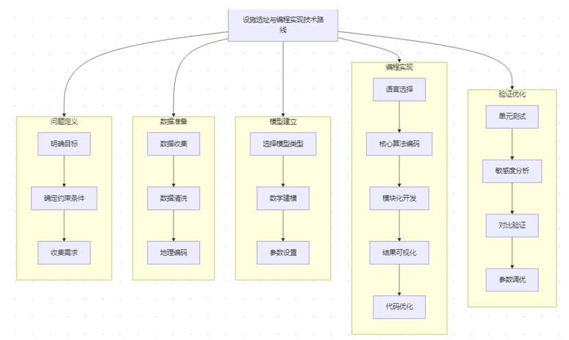 设施选址问题(Facility Location Problem, FLP)是运筹学和物流管理中的经典优化问题,旨在确定设施(如仓库、工厂、医院等)的最佳位置以满足需求点的需求并最小化成本(如运输成本、建设成本等)。其技术路线通常包括问题建模、算法选择、编程实现、测试验证四个核心步骤。以下是详细的技术路线和实现方案: