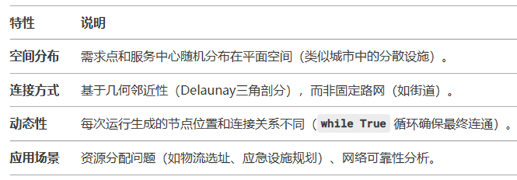 然后是基于Delaunay的三角剖分,将生成的随机需求点和服务中心的坐标作为输入,生成三角网格,确保无孤立点。每条边的边权重设置为:边的长度为两点欧氏距离的 1.2倍(模拟实际路径的弯曲系数)。