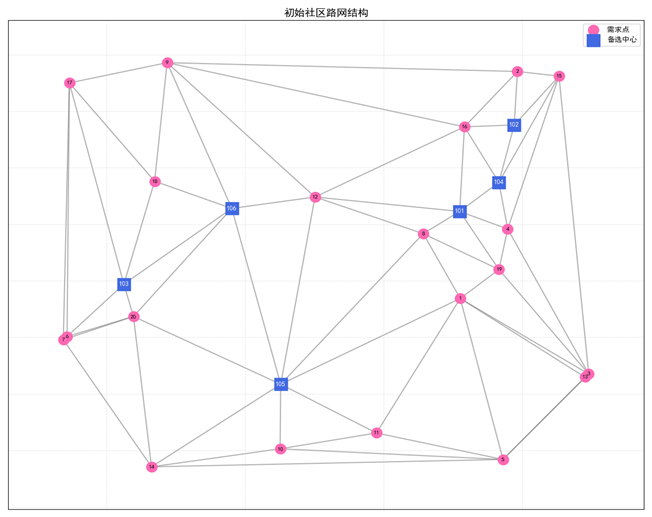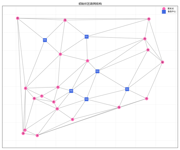 根据以上流程算法,随机生成的社区路网图如果4-2-1所示,其中红色的圆点为需求点,即社区位置,共20个社区点,蓝色的正方形点为备选的物流服务中心,共6个备选中心,假设需要在6个备选中心中选取3个物流配送中心,优化计算后,程序运行正常,程序运行结果如图4-2-2所示,分别给出了三个分配到的配送中心坐标及在路网中的编号,每个分配中心覆盖的社区需求点编号。选中的配送中心及相应的路网规划更直观的显示如图4-2-2所示,红色方形为选中的配送中心,标红的路线为选中的路网线路。