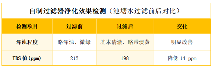 但是对TDS去除有限。过滤前池塘水TDS平均值为212 ppm,过滤后为198 ppm,仅下降14 ppm(约6.6%)。这说明自制过滤器虽然能挡住“看得见”的杂质,但对于“看不见”的溶解性矿物质(如钙、镁、钠等离子)去除能力很弱。要想真正降低水的硬度或TDS值,需要更专业的过滤材料,如离子交换树脂或反渗透膜,简易过滤器无法替代专业净水设备。