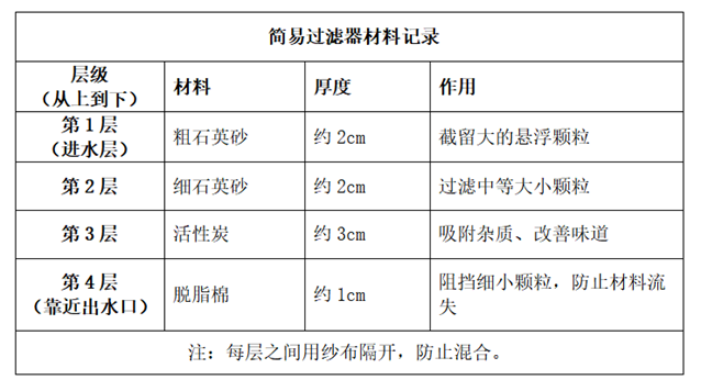 2.自制简易过滤器能“滤浑”但难“除盐”:利用饮料瓶、石英砂、活性炭、纱布、脱脂棉制作的简易过滤器,对池塘水的浊度改善明显,原本微绿浑浊的池塘水经过滤后变得清澈透明,说明活性炭和石英砂的物理截留与吸附作用能有效去除悬浮颗粒、藻类和大分子有机物。肉眼观察,净化效果显著。
