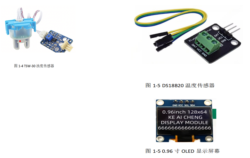 1.监测设备:“基于STM32的智能水质监测系统”(带水温传感器、浑浊度传感器、TDS传感器、显示屏)