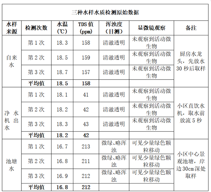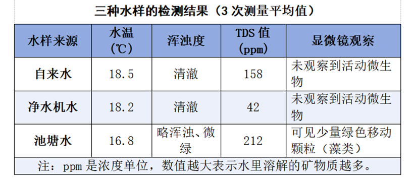 1.利用智能水质监测系统,检测小区不同水源(自来水、净水机水、池塘水)的水温、浊度、TDS值,并结合显微镜观察,分析水质差异及原因。