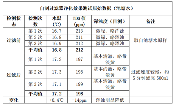 表1.2-3自制过滤器净化效果测试原始数据(池塘水)