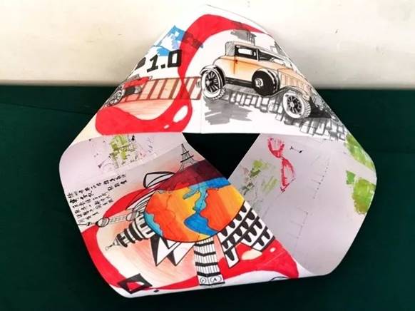 全球化浪潮中,没有国家是一座孤岛。寄荃队队员们以春夏秋冬为背景体现全球化特点,用莫比乌斯环为形式表现融合之意。第一幅画作是全球化1.0时期,英国工业革命制造出蒸汽机车,驶向机器时代。新式交通工具的出现标志着2.0时代的到来,也密切了世界的经济文化交流,全球化一如春天般盛放。进入3.0时代,中国在世界舞台上饰演着重要的角色。“复兴号”高铁展示科技实力,彰显中国速度。东方蛟龙――长城,为此高唱着盛夏之歌。展望未来,一带一路将担起传承与希冀,把亚欧大陆联结一体。我们共筑“地球村”,迎接成熟的金秋时节。四季轮回,但世界处于永恒的发展之中,莫比乌斯环在三维世界中无限延展,正寓意着全球化的无限潜力。红色丝绸贯穿画作始终,生机与活力交融。漫漫征途,春夏秋冬,致行乾坤,你我走过!