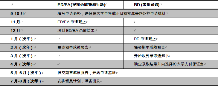 每所美国大学都有不同的录取方式,如ED、EA、RD申请。由于每所学校的申报截止日期互不相同,务必提前查看大学网站以保证申请的顺利进行。 以下给出一些具有共性的时间节点,供学生参考: