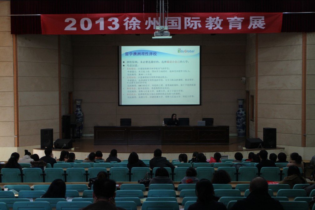 11月16日上午,徐州国际教育展在徐州一中夹河街校区举行。展会由徐州市第一中学主办,新加坡高博布莱顿教育集团与徐州环球雅思英语学校协办,吸引了包括美、英、澳、加等国20所大学前来参展。展会现场除设各学校咨询台,针对不同国家的留学专题演讲也同时进行。