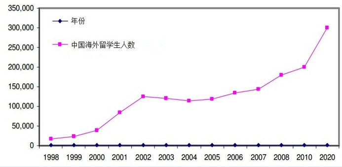 由于政府的鼓励政策,中国留学生的人数从2000年开始显现出明显增长,至2006出现留学热潮。据统计,截至2010年中国就读于海外的留学生已增长至20万人,预计到2020年这一数值将增至30万。随着全球化进程的推进,中国在各个领域的对外交流深度仍将继续扩大,良好的跨国跨文化交流能力将是未来年轻人必备的工作素质之一。在这一大环境下,出国留学将会成为多年轻人进行高等教育及深造的选择。